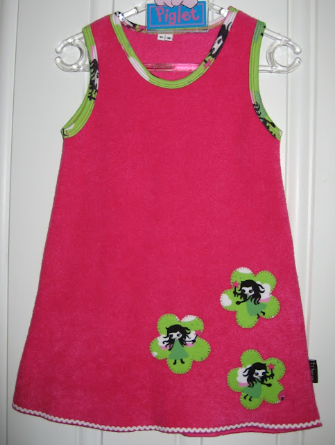 Disse grønne feene er min favoritt! Knall sterke farger. Den passet perfekt til den knallrosa vinterfrotteen jeg hadde liggende. Vinterfrotte, eller frottefleece som jeg ville ha kalt det, er frotteaktig på fremsiden og har en veldig myk flossete bakside, samme som fleece. Veldig myk, god og varm kjole dette. Ble virkelig knæsj som sett! Body og kjole kan kjøpes separat også.